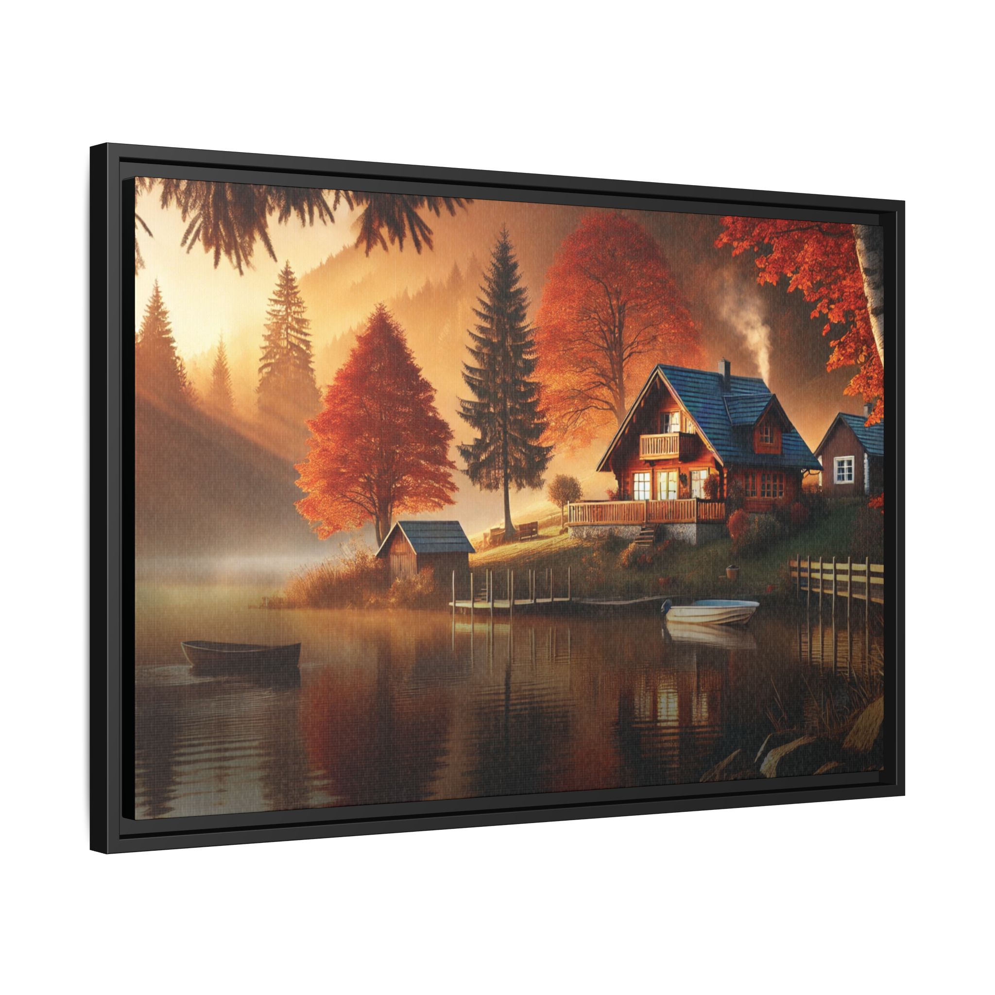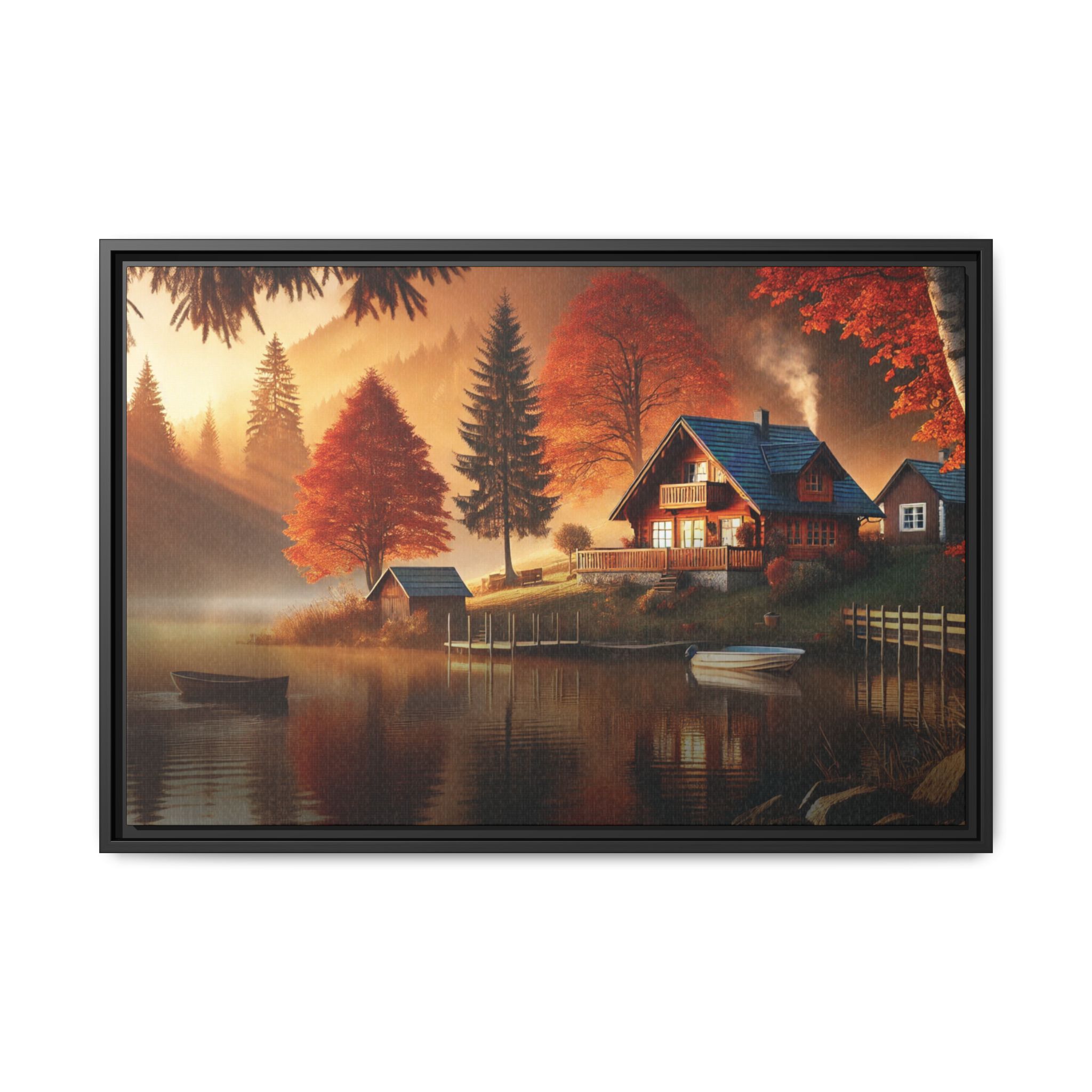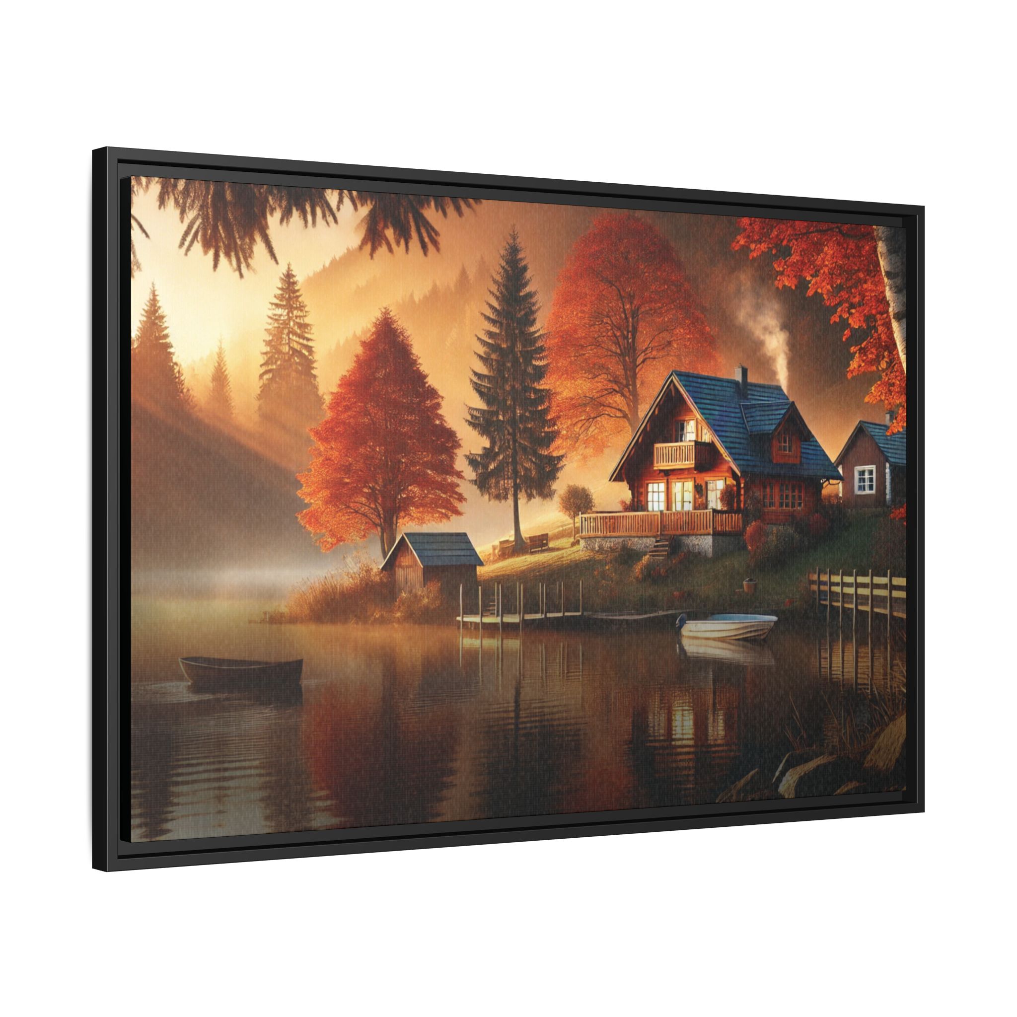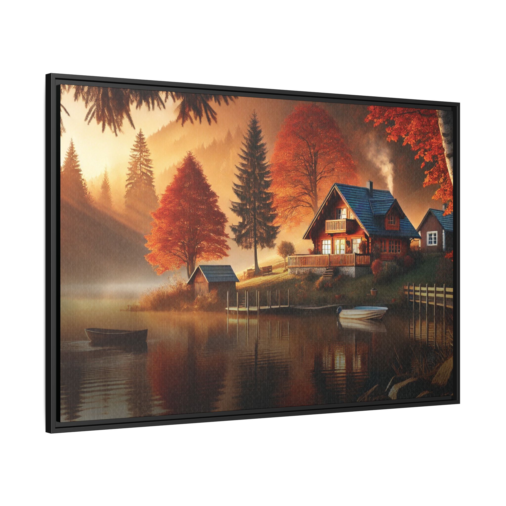 Autumn Reverie captures a tranquil moment where nature’s vibrant hues and serene stillness converge. The warm glow of sunset dances on the rippling lake, blending with the fiery reds and oranges of the autumn trees, creating a symphony of color and light. The wooden dock and rowboat evoke a sense of quiet adventure, inviting the viewer to drift into the misty waters and leave behind the noise of the world. This piece reflects the harmony of solitude, nature’s cycles, and the fleeting beauty of autumn’s embrace.